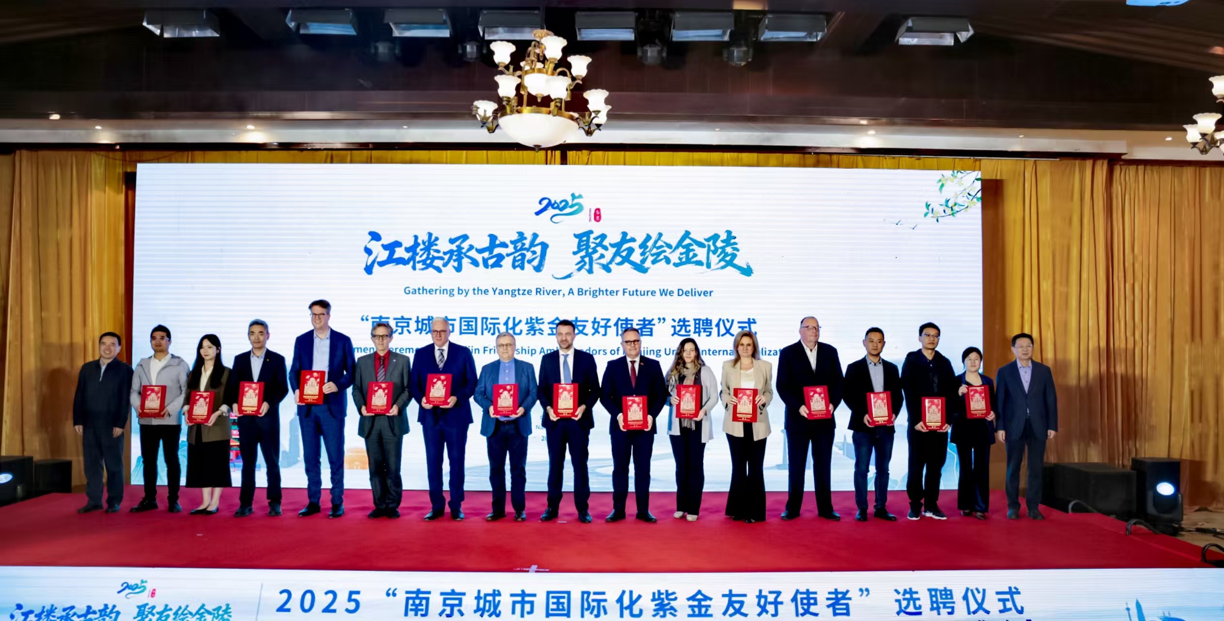 10月22日,由南京市商務局、市外辦、鼓樓區政府共同主辦的2025(第六批)“南京城市國際化紫金友好使者”選聘儀式在閱江樓舉行。安迪蘇副總經理,人力資源、組織和紀律執行副總裁Fabien Siguier(思法斌)等16位熱心于南京城市國際化建設的國際友人及海外華人受聘為“紫金友好使者”。